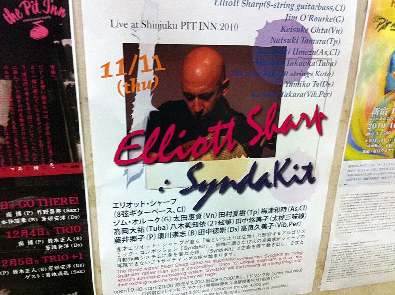 I went to see Elliott Sharp and 11 other assorted Japan-based musicians perform his composition SyndaKit the other night at the Pit Inn in Shinjuku. It was a full house, testament not only to the renown of Sharp himself, but also to the impressive roster of performers sharing the stage with him.