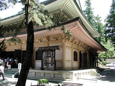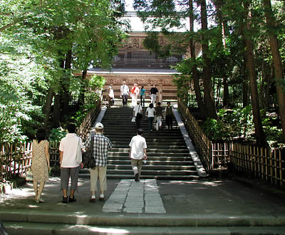 Walk up on ahead about 20 or 30 meters until you come to Butsu-den (仏殿) on your left, as pictured below. (Note: when I visited Engaku-ji on June 21, 2003, this temple building was undergoing restoration and was completely covered in sheets and scaffolding). |