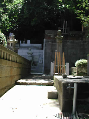Proceed up these stairs, at the top of which you'll see a watering station to your right and more buckets to your left. Make a left here, and you'll be facing Ozu's grave as such: |
