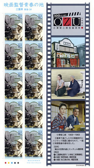 Ozu commemorative stamp, published by Japan Post on October 23, 2003 (brief English here), to celebrate the centennial of Ozu's birth. Issued in 三重県 (Mie Prefecture)*, part of Japan Post's ふるさと切手 (furusato kitte, hometown stamps) series. *Mie is where Ozu spent his teenage years. |