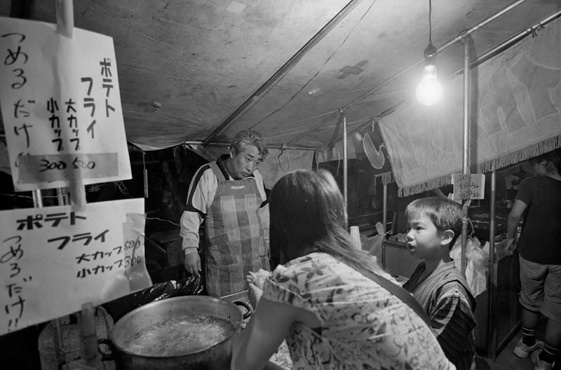 | Adjudicator's comment on this entry: I am guessing this is some sort of hot delicacy that is served on the street. Five hundred yen for a big one and 300 hundred yen for a small one. I like the vendor's expression. |